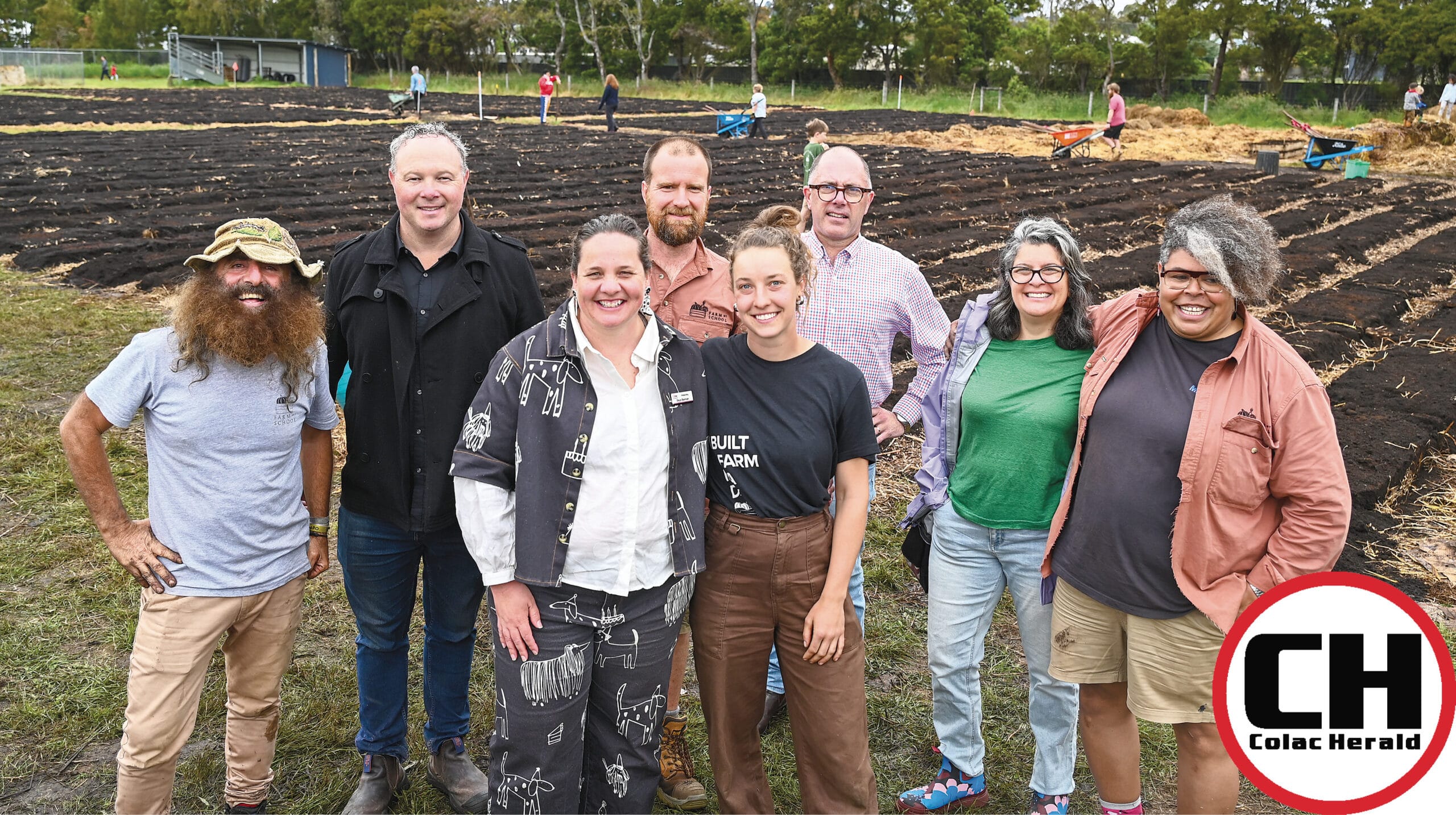 MAMMOTH EFFORT: Gardening Australia and Farm My School ambassador Costa Georgiadis, Colac Otway Shire Council mayor Jason Schram, Farm My School’s James McLennan, Polwarth MP Richard Riordan, Vic Health chief Anna Peeters and chef Nornie Bero, and front, Colac Secondary College principal Skye Bannan and farm manager Catie Tacey.