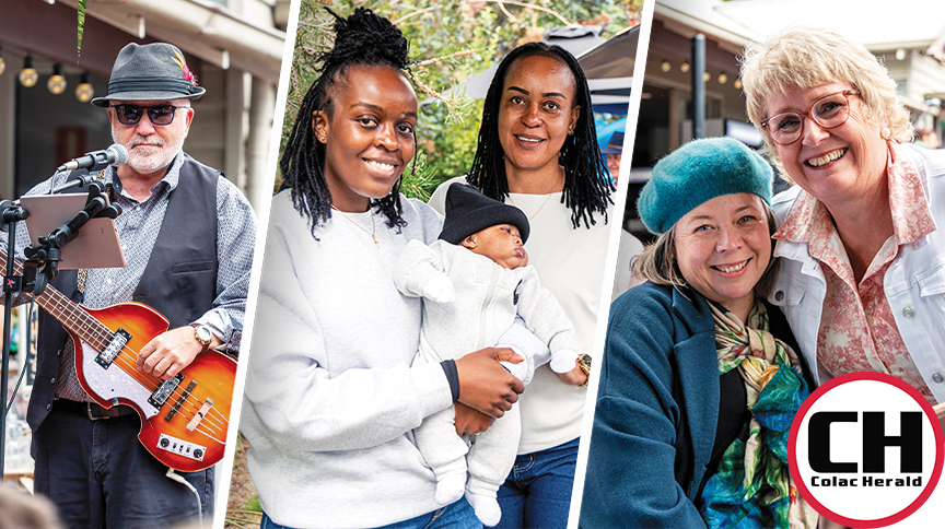 From left: Local entertainment the Band ‘o’ Coots, Reina and Azariah Madanhi with Phyllis Chikomo, and Blooms the Chemist Colac’s Fiona Okeson with Colac Area Health chief executive Fiona Brew.